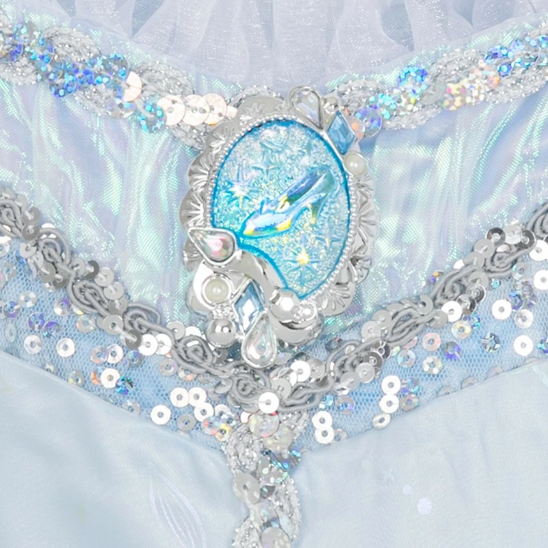 Cinderella’s arrival will grace any royal ball in this enchanting costume. With a ”Bibbidi-Bobbidi-Boo,” our glittering gown, detailed in sequins, glowing foil filigree, organza trims, and a bejewelled cameo, makes every dream that you wish come true.