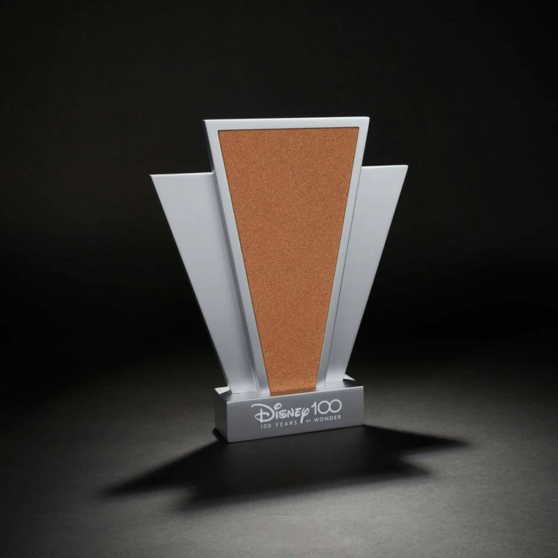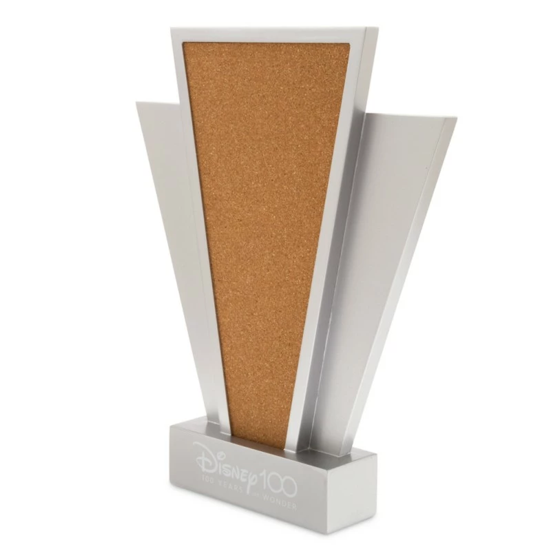 Disney Pin enthusiasts can showcase their collection of platinum-finish keepsakes on this stylish display with ”cork” board backer and shimmering Disney100 base plate.