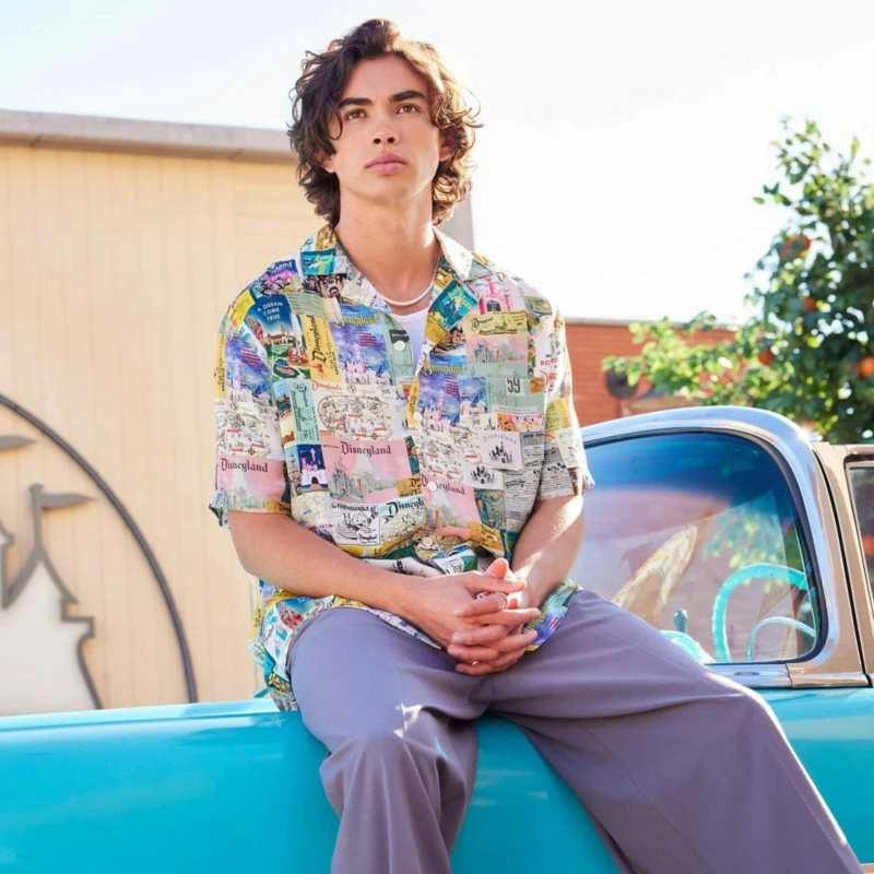 A nostalgic collage of vintage Disneyland print media makes a magical impression on this woven button front camp shirt with collar and chest pocket. It’s a dapper look for any Disney day!