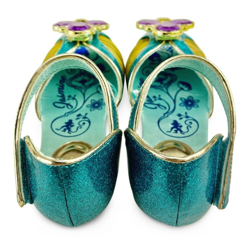 Blossom like a desert flower in these glittering ankle strap shoes with golden trims and faceted gem adornments, made to match magically with our Jasmine costume collection.